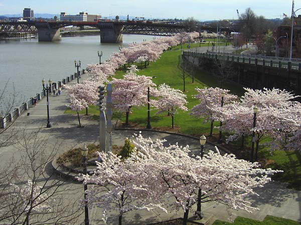 The cherry trees are in full bloom along the Willamette River in Tom McCall Waterfront Park in Portland, Oregon.