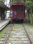 -- it looks like a railroad depot and there's a caboose sitting on tracks along