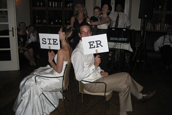 They used signs to answer "Sie" (she) or "Er" (he). The crowd enjoyed it